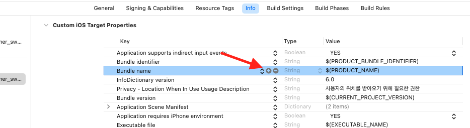 프로젝트의 Targets -> Info에서 Bundle name의 + 버튼을 클릭하여 추가